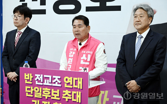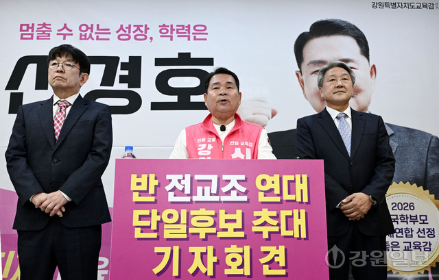 신 예비후보는 27일 도교육청에서 기자회견을 열고 조백송 전 강원교총 회장, 김익중 전 강원특별자치도교육청 진로교육원장과의 단일화를 공식 선언했다. 두 사람은 신 예비후보 선거대책위원회 공동선대위원장을 맡을 예정이다. 신 예비후보는 “두 후보의 결단은 특정 인물이 아닌 강원교육의 방향과 원칙을 위한 선택”이라며 “반 전교조연대는 우리 아이들의 배움과 교육의 균형을 지키기 위한 책임 있는 연대”라고 밝혔다.