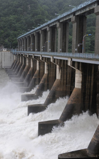 장마전선의 영향으로 도내 전역에 호우특보가 발효된 9일 한국수력원자력 의암수력발전소가 수문을 개방, 초당 1,300여톤을 하류로 흘려보내고 있다.