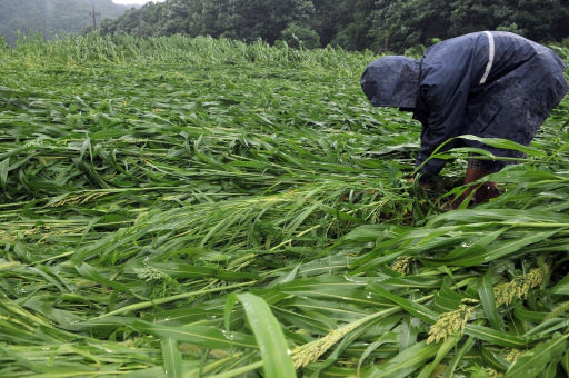 도내 전역에 호우특보가 내려진 9일 오후 원주 지정면에 한 옥수수밭의 옥수수들이 강풍에 휩쓸려 쓰러져 있다.