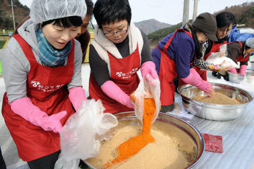 9일 오전 춘천 동면 상걸2리에서 열린 '콩이랑 상걸리 전통장 담그기' 행사 참가자들이 고추장, 막장 등의 전통장을 담그며 즐거운 시간을 보내고 있다.