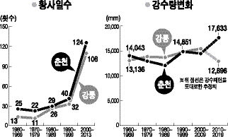 황사도 급증하고 있다. 1970년부터 1979년까지 10년간 춘천에서는 총 22일, 강릉 11일간 황사가 관측됐다. 당시만해도 춘천의 황사는 1년 동안 평균 2일, 강릉에서는 단 하루 동안만 황사가 찾아온 것이다. 하지만 1990년대에는 춘천 4일, 강릉 3.2일 정도로 20년 만에 2~3배가량 늘었다. 2000년 이후로는 춘천의 황사가 1년간 10.2일이나 됐고 강릉도 8.7일로 폭증했다.
