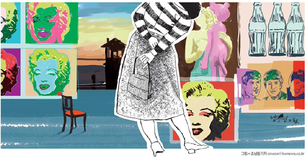 다음 작품은 코카콜라 병이었다. 나비넥타이에 이은 앤디 워홀(Andy Warhol)의 작품이었다. 홍 여사는 두어 걸음 뒤로 물러나 코카콜라 병들을 바라보았다. 불량품이라고 짚어낼 만한 병들이 군데군데 섞여 있었다. 가장 윗줄 첫 번째 콜라병이 홍 여사는 가장 마음에 들었다. 짙고 선명한 선과 병목에까지 골고루 채색된 녹색, 그 병에 든 콜라가 진짜일 게 확실해 보였다. 홍 여사는 혀를 내밀어 재빨리 입술을 축였다. 소풍 때마다 홍 여사의 엄마는 가방 속에 사이다와 바나나, 삶은 달걀과 김밥도시락을 넣어주었다. 병째 가져간 사이다는 미지근하다 못해 뜨끈뜨끈했다. 톡 쏘는 맛은 똑같았어도 그 시절 홍 여사는 사이다보다 콜라를 더 좋아했다. 굴곡진 코카콜라 병은 다보탑 같았다. 사람들은 석가탑을 더 쳐주었지만 홍 여사는 언제나 화려하고 정교한 다보탑을 더 마음에 들어 했다. 다보탑을 닮은 코카콜라 병 속에 담긴 형용할 수 없는 맛의 검은 물. 그것은 마시기만 해도 그 사람을 세련되게 만들어주는 마법의 물이었다. 지독히도 건조하고 신랄하면서도 집요하기까지 한 앤디 워홀의 작품들. 홍 여사의 입매가 일그러졌다. 똑같이 생긴 캠벨 깡통들은 아무리 재료가 달라도 죄다 똑같은 맛일 것만 같았다.