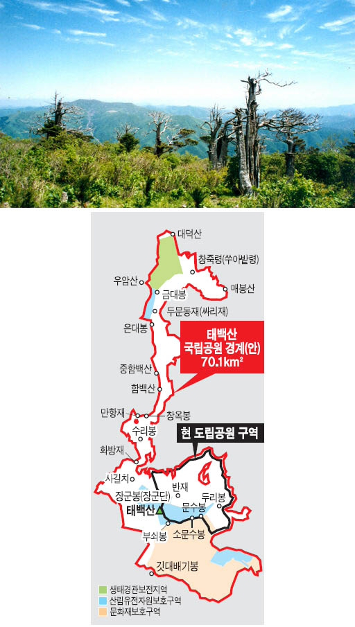 태백산국립공원 구역은 △태백시 51.2㎢ △영월군 0.1㎢ △정선군 0.9㎢ △경북 봉화군 17.9㎢ 등 총 70.1㎢로 기존 도립공원 면적(17.4㎢)의 4배에 이른다. 위로는 오대산국립공원, 아래로는 소백산국립공원과 맞닿아 있다. 백두산에서 출발해 지리산으로 이어지는 백두대간 중 설악산, 오대산, 소백산, 월악산, 속리산, 덕유산, 지리산 등 주요 산은 일찌감치 국립공원으로 지정됐다.