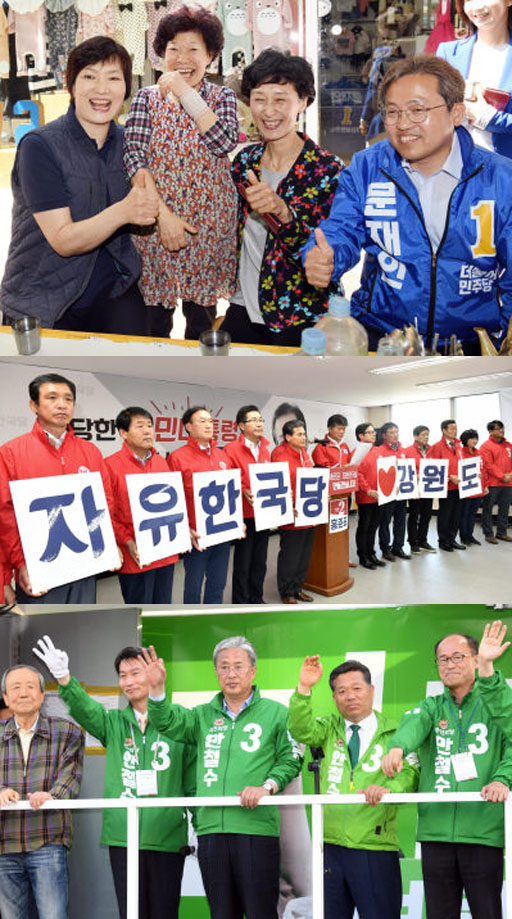 자유한국당은 도의원 및 시·군의원 119명을 전면에 내세웠다. 김성근·김기홍 도당 선대위원장과 함종국 도의회 원내대표 등은 이날 도당 사무처에서 기자회견을 열고 “안보가 위협받고 있는 지금이야말로 3% 도민의 힘을 보여줘야 할 때”라며 “진짜 보수인 홍준표 후보를 찍어야 자유대한민국을 지킨다”고 말했다. 이어 “이번 선거의 책임에서 자유로울 수 없는 무거운 책임감을 통감하고 있다. 죄송하다. 반성한다”며 “대한민국의 위기 앞에서 한 번 더 고민하고 홍준표 후보를 선택해 달라”고 했다. 이들은 회견 후 도민들을 향해 큰절을 하기도 했다.