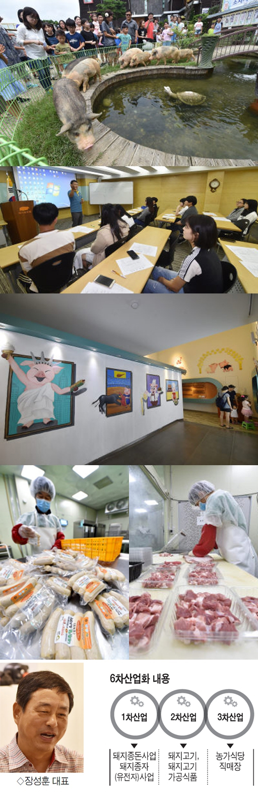 ■외국산이 못 하는 '나만의 스토리'로 마케팅=금돈의 한 달 매출액은 18억원 정도로 1차 산업의 비중이 65%, 2차 가공식품이 20%, 3차 산업 비중은 15% 정도다. 매출로만 보면 돼지문화원은 큰 비중은 아니다. 품종이 가장 높다는 삼원교잡종에 미네랄 워터를 먹여 키운 돼지여서 대기업으로도 납품된다. 1차 생산만으로도 돈을 벌 수 있었고, 오히려 2011년 개원한 돼지문화원은 5년간 고객도 없었다. 장성훈 대표는 1차 산업으로 번 돈을 3차 산업에 투자하는 꼴이었지만 포기하지 않았다. 장 대표는 “외국산이 밀려오고 양돈업에 대한 환경규제, 비호감도가 높아지는 현실에서 나만의 브랜드, 스토리로 팔아야 한다고 판단했다”며 “생산은 나만 잘 하면 됐지만, 2·3차 산업은 남이 알아줘야 성공하기 때문에 자리 잡는 데 시간이 걸렸다”고 했다.