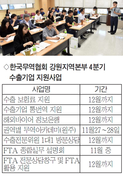 한국무역협회 강원지역본부는 수출기업들의 전문 멘토링, 코칭도 맡고 있다. 도내 기업의 임직원, 창업 희망자들을 대상으로 한 권역별 무역아카데미도 개최 중이다. 내달 27~28일 원주에서 열린다.