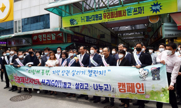 최 지사는 이날 춘천시 소양동 주민센터에서 긴급재난지원금 60만원(2인 가구)을 강원상품권 1만원권 60매로 수령한 후 강원도청 공무원, 도의원 등과 중앙시장을 찾아 '다 함께 동행, 지역경제 살리기 챌린지! 긴급재난지원금 쓰리 GO(돕고·살리고·나누고) 캠페인'을 펼쳤다.