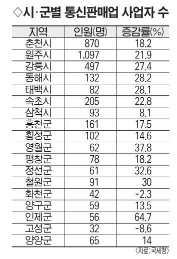 국세청이 최근 발표한 올 2월 기준 100대 생활밀접업종 사업자 현황에 따르면 전자상거래 기반인 통신판매업의 강원지역 사업자 수는 3,785명으로 전년 대비 21.3% 증가했다. 100개 업종 가운데 통신판매업의 증가율이 1위였다. 사업체수 증가 폭은 더 가파르다. 강릉시의 경우 올 1~5월 신규 등록된 통신판매업 사업체 수는 242개로 전년 대비 42% 증가했다. 원주시도 신규 등록 사업체 수가 지난해 7월에는 500개였지만 올해는 5월에 이미 500개를 넘어섰다.