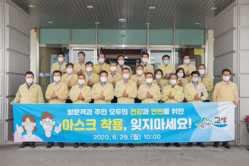 고성군은 29일 군청 현관 앞에서 함명준 군수를 비롯한 실·과·소장 등이 참가한 가운데 마스크 착용 생활화를 다짐하는 캠페인을 펼쳤다.