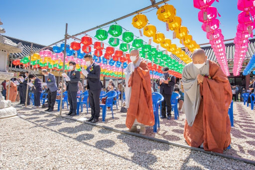 고성 금강산 건봉사(주지:현담스님) 불기 2565년 부처님 오신 날 봉축법요식이 19일 건봉사 대웅전에서 함명준 고성군수, 지역 내 기관·단체장, 신도, 주민 등이 참석한 가운데 봉행됐다.
