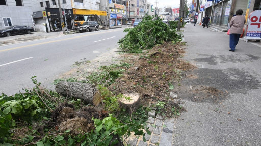 강릉시내 옥가로 테마거리 조성을 위해 가로수 수십 그루가 훼손돼 시민들이 반발하고 있다.
