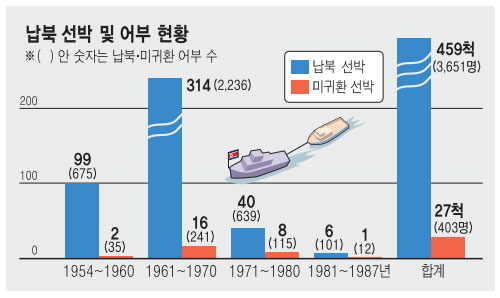 1987년 우리 정부의 국무조정실 남북전력기획단이 작성한 ‘연도별 해상납북 및 송환통계' 자료에 따르면 동·서해상에서 납북된 선박 459척, 어민 3,651명 가운데 314척(68.4%), 2,236명(61.4%)이 1961년부터 1970년까지 집중적으로 피해를 입었다.