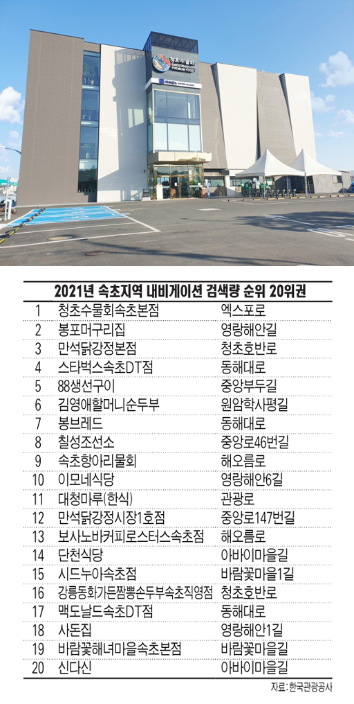 속초에 가면 유독 눈에 띄는 풍경이 있다. 하얗고 네모난 상자를 관광객 저마다 손에 쥐고 있는 모습이다. 시내 곳곳에 포진한 ‘만석닭강정'이다. 그중에서도 엑스포공원 주변의 본점이 검색량 3위에 올랐다. 4위는 ‘스타벅스속초DT점'인데 속초를 가로지르는 동해대로에 위치해 있어 관광객들에게 인기만점이다. 5위는 중앙부두길에 위치한 ‘88생선구이'였다.