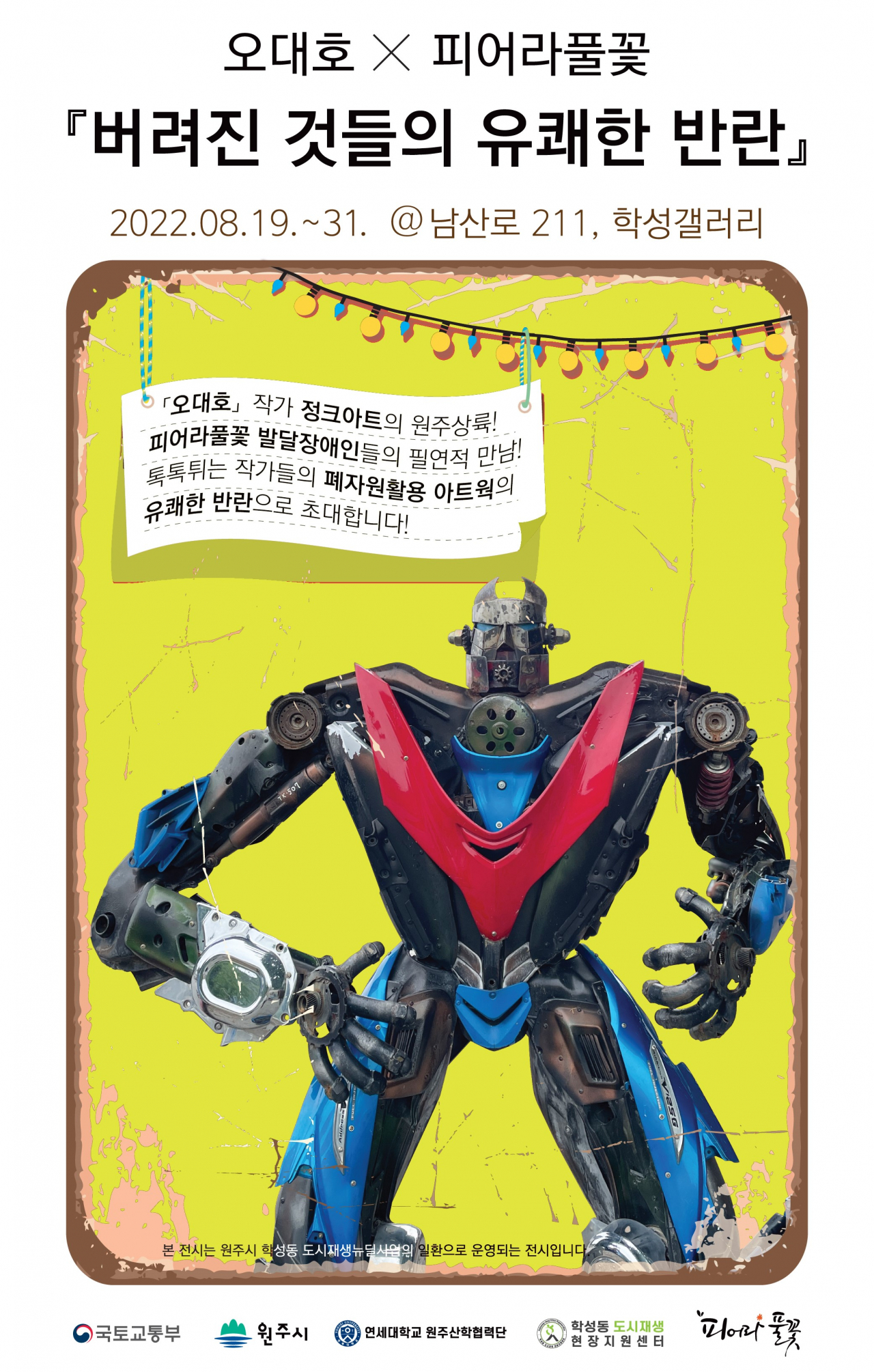 학성동도시재생현장지원센터는 폐품을 작품으로 만드는 정크아트 전시 ‘버려진 것들의 유쾌한 반란’을 19일부터 31일까지 학성갤러리에서 개최한다. 전시에는 오대호 작가와 발달장애인 주간보호활동기관 피어라풀꽃 사회적협동조합이 참여한다. ‘만지고, 돌리고, 타면서, 즐기는’을 주제로 한 태권브이 정크 작품을 비롯 키네틱 아트, 아트바이크, 오브제 등 22점의 작품과 환경에 대한 인식개선을 목적으로 제작된 업사이클링 작품들이 전시된다. 오대호 작가는 버려지는 폐품을 활용해 20년간 6,000여점의 작품을 제작해온 국내 1호 정크 아티스트이다.