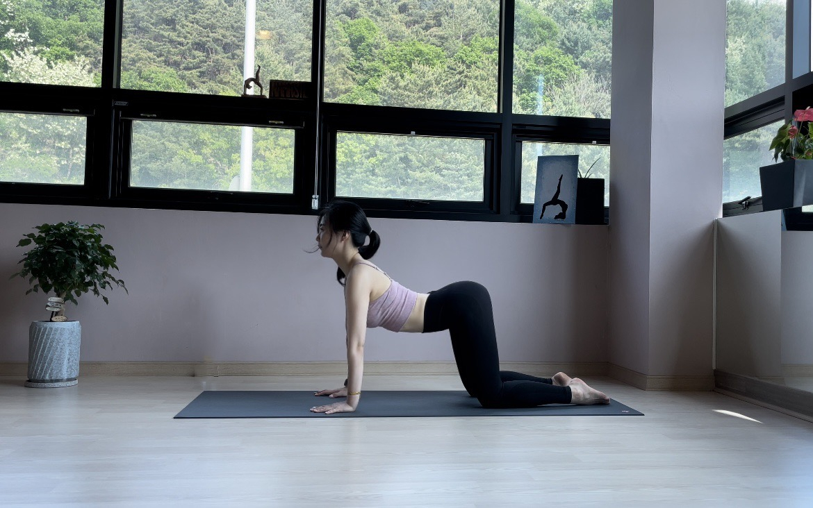 첫 번째로 소개할 동작은 요가 자세 중 잘 알려져 있고 쉽게 따라 할 수 있는 소·고양이 자세다. 고양이 자세는 척추 전체에 굳어진 근육과 그로 인한 신경을 바르게 풀어주며 자세도 바르게 만들어 준다. 소자세는 상체와 목의 스트레칭에 아주 효과적이며 척추부터 허리의 탄력과 유연성을 높여주는 효과가 있다.