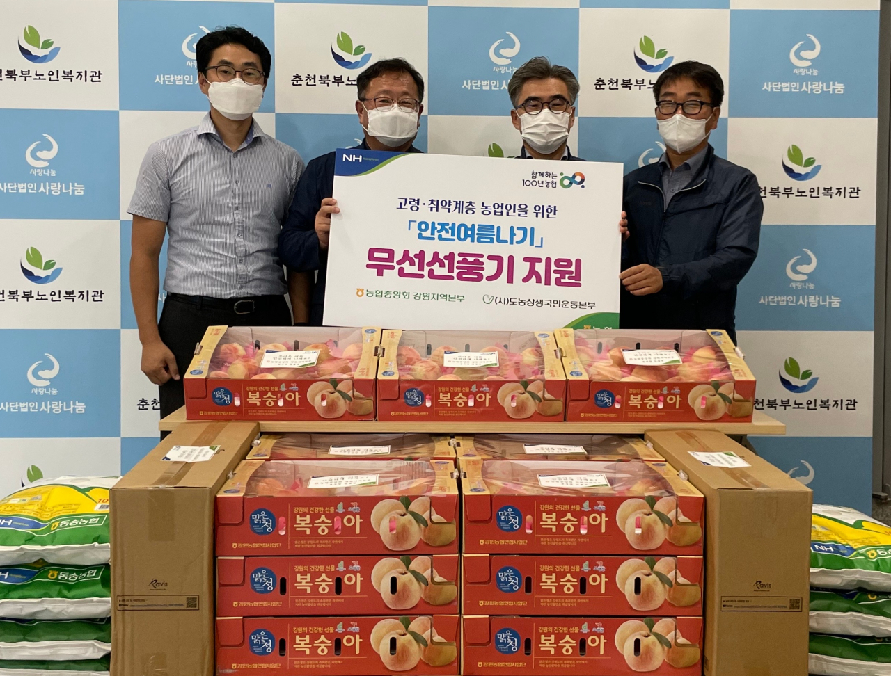 농협중앙회 강원지역본부(본부장:김용욱)와 (사)도농상생국민운동본부는 12일 고령‧취약계층 농업인의 폭염피해 예방 및 온열환자 발생 최소화를 위해 선풍기, 쌀, 제철과일 등을 춘천북부노인복지관에 전달했다. 강원농협은 18개 농협 시‧군지부를 통해 도내 고령‧취약계층 농업인에게 무선선풍기 100대를 지원할 예정이다.