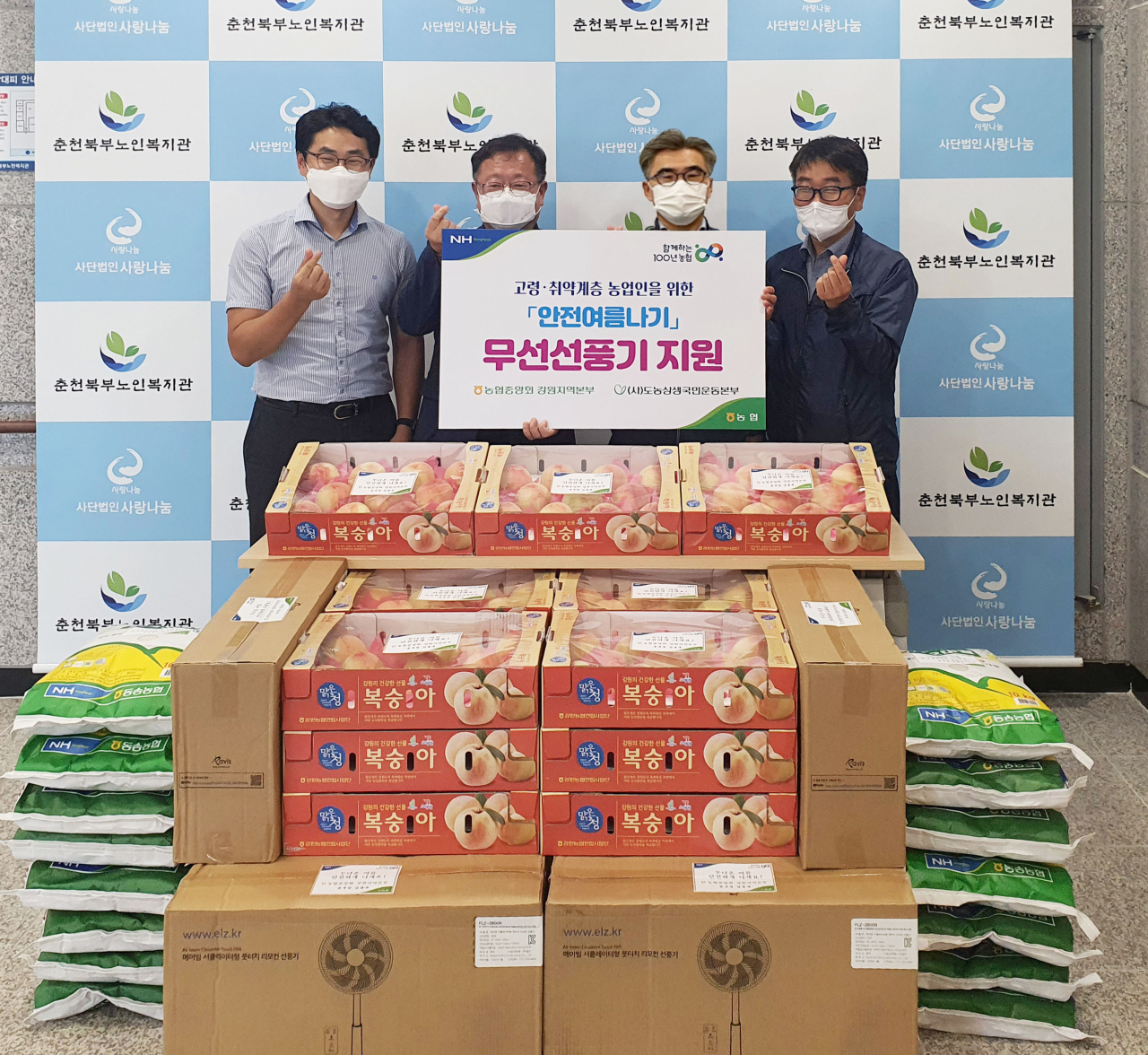 ◇농협중앙회 강원지역본부(본부장:김용욱)는 12일 고령·취약계층 농업인 폭염피해 예방과 온열환자 발생 최소화를 위해 춘천북부노인복지관(관장:박재호)에 물품을 전달했다.