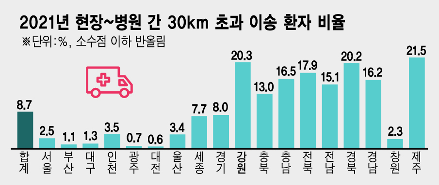 소방청의 '2022년 119 구급서비스 통계연보'에 따르면 2021년 강원도내 구급 현장에서 병원까지 이송된 환자들의 평균 이동거리는 14.5㎞로, 서울(7.0㎞)의 약 2배였다. 강원도내에는 서울과 비교해 응급환자를 이송할 수 있는 의료기관이 적고, 농·어촌 의료취약지에서는 더 먼 거리를 이동해야 하기 때문에 벌어지는 일이다. 강원도 뿐 아니라 경북(16.8㎞), 충남(16.6㎞)등 농·어촌 비중이 큰 지방자치단체는 모두 서울에 비해 평균 2배 이상의 거리를 이동해 응급환자를 이송하고 있는 것으로 파악됐다.