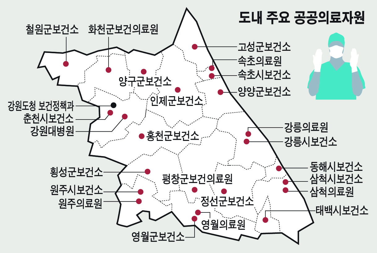 철원에는 확진 환자를 받을 수 있는 공공의료기관이 1곳도 없고, 지역응급의료기관조차 갈말읍 소재 단 1곳밖에 없다. 강원도 뿐 아니라 서울을 제외한 10개 광역지방자치단체에 98곳의 응급의료취약지가 있다.