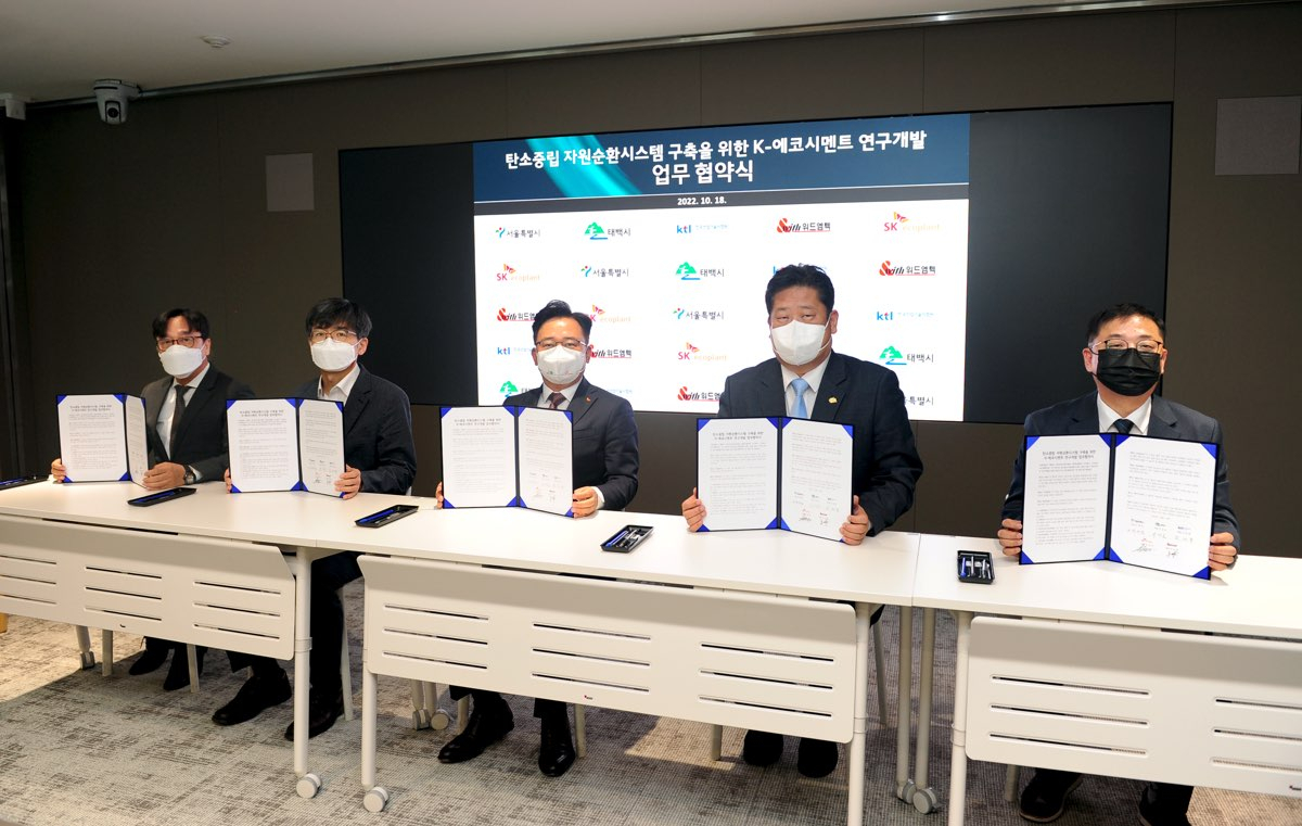 협약식에는 이상호 시장을 비롯해 윤재삼 서울시 자원회수 시설추진단장, 김세종 한국산업기술시험원장, 박경일 SK에코플랜트 대표이사, 박동철 위드엠텍 대표이사가 참석했다. 태백시와 서울시는 앞으로 자원 재활용과 탄소 중립에 기여하기 위해 친환경적인 시멘트 생산기술 개발을 공동으로 지원하고 태백시는 K-에코시멘트 개발을 위한 연구시설 설치 부지 검토 등 행정지원도 약속했다.