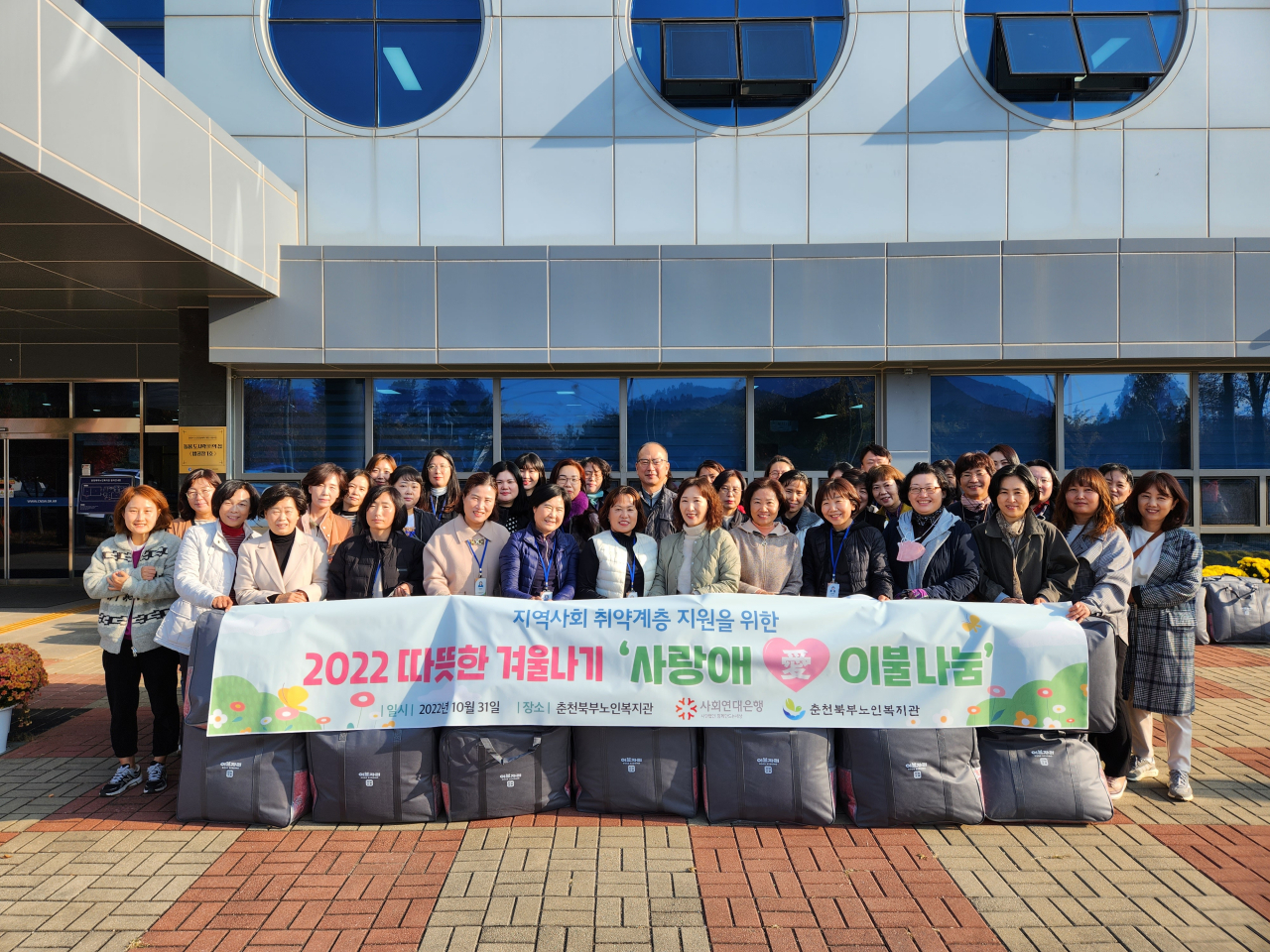 춘천북부노인복지관은 1일 사회연대은행을 통해 후원받은 동절기 이불 125채를 지역사회 취약계층 어르신에게 직접 전달하는 '사랑애(愛) 이불나눔' 행사를 진행했다.