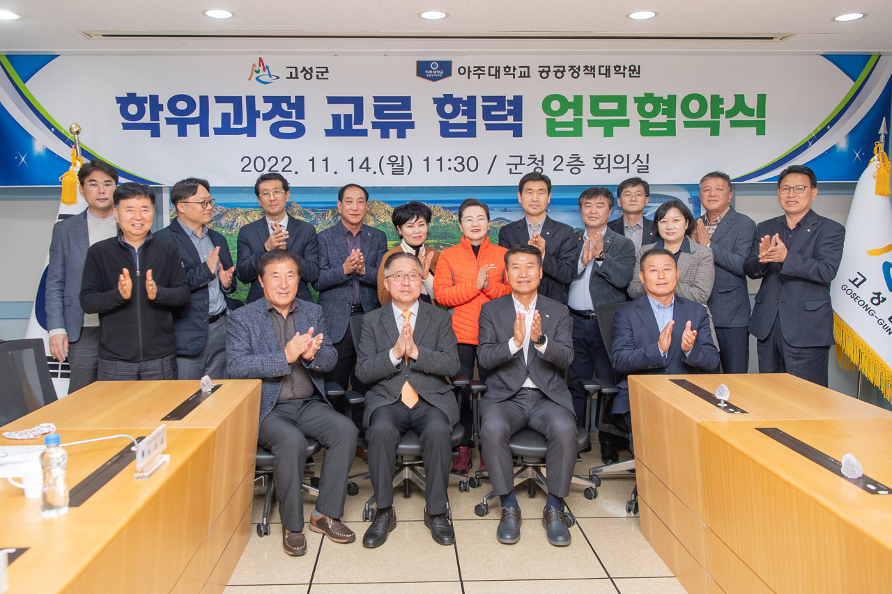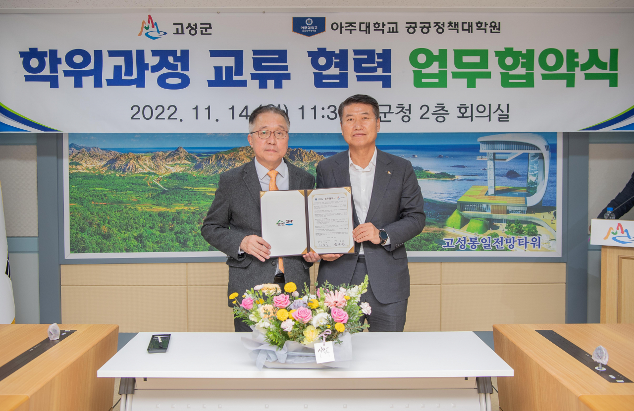 고성군은 14일 오전 군청 회의실에서 아주대학교 공공정책대학원과 학위과정 교류협력을 위한 업무협약식을 체결했다.