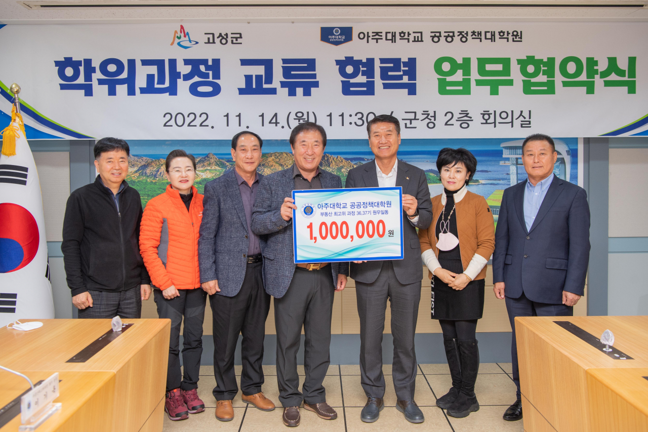 특히 이날 아주대학교 공공정책대학원 신화철 교수 및 학생들은고성군 미래인재 육성을 위한 고성향토장학금 100만원을 기탁하며 협약의 의미를 더했다.