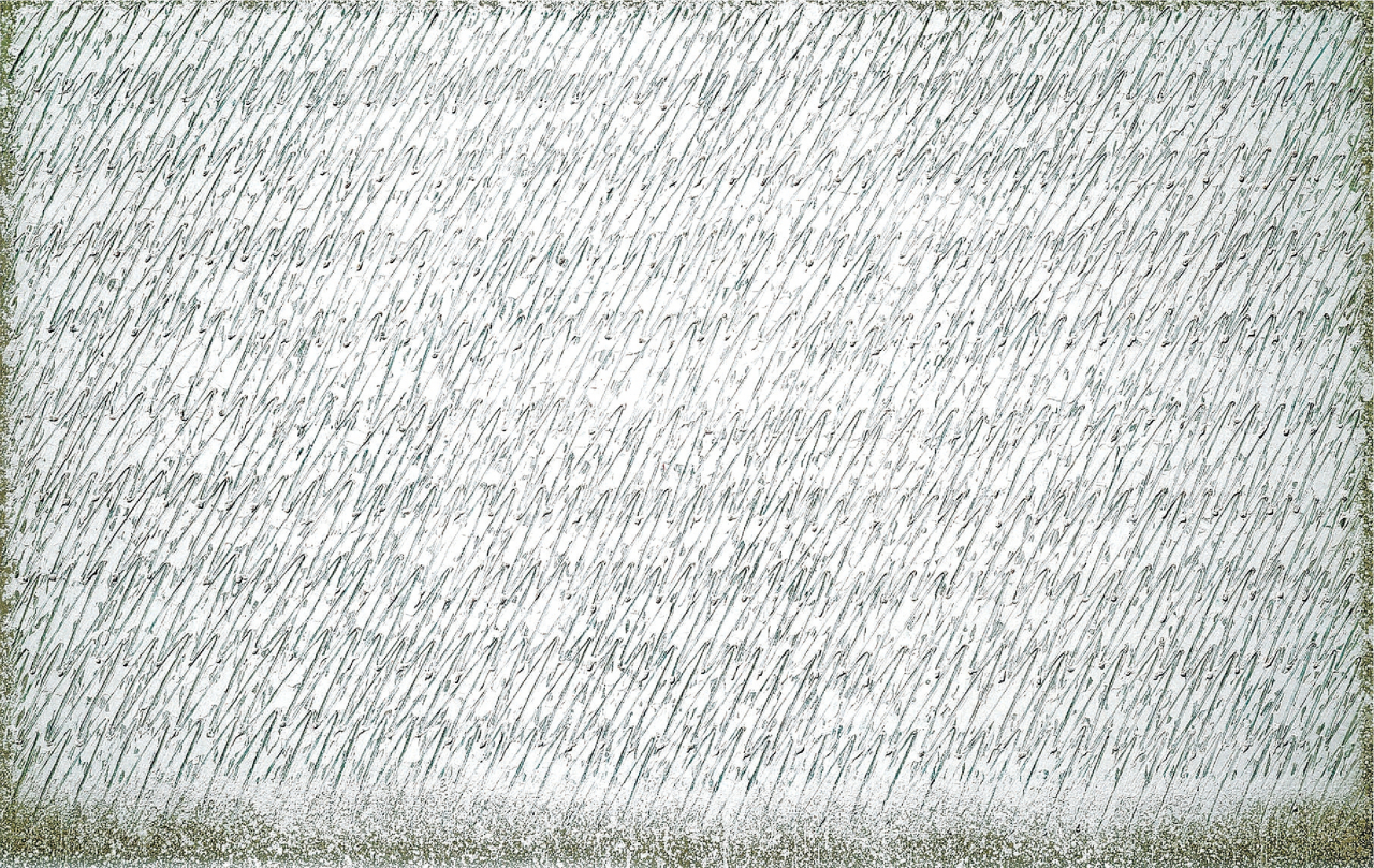 묘법 연작 초기에 캔버스에 유채물감과 연필로 작업하다가 1980년대 이후 한지를 사용하기 시작한 것도 그렇다. 서양의 종이와 달리 색과 빛을 흡수하는 성질의 한지는 ‘물아일체’를 실행하고자 하는 작가의 동양적 철학과 일맥상통하는 매체였다. 나아가 그 위에 흔적을 남기는 방식, 즉 한지가 젖어 있는 동안 연필을 반복적으로 사용해 골을 만들고 음영을 부여한 건 연필이라는 도구를 종이의 원초적인 물질성에 굴복시켰다고 해석할 수 있다. 그 결과, 화면에는 연필의 흔적이 아닌 과정과 질서만이 오롯이 남는다.