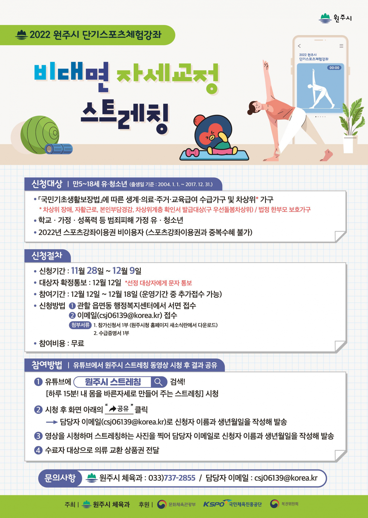 이번 강좌는 코로나19 재확산을 막기 위해 비대면으로 진행되며, 다음달 12~18일 유튜브에 원주시 스트레칭을 검색하면 자유롭게 수강할 수 있다. 문의는 시 체육과 체육정책팀((033)737-2855)으로 하면 된다.