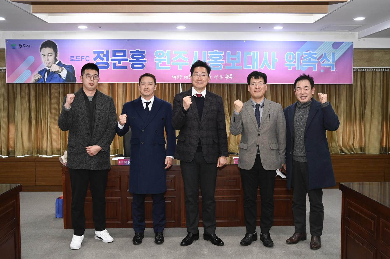 원주시(시장:원강수)는 5일 원주시청 7층 투자상담실에서 정문홍 로드FC 대표를 원주시 홍보대사로 위촉했다. 정문홍 대표는 원주 출신으로 2010년 로드FC를 창립, 대한민국 격투기 산업을 개척했으며, 이날 홍보대사 활동 여비 전액을 기부한다는 뜻을 밝혔다.