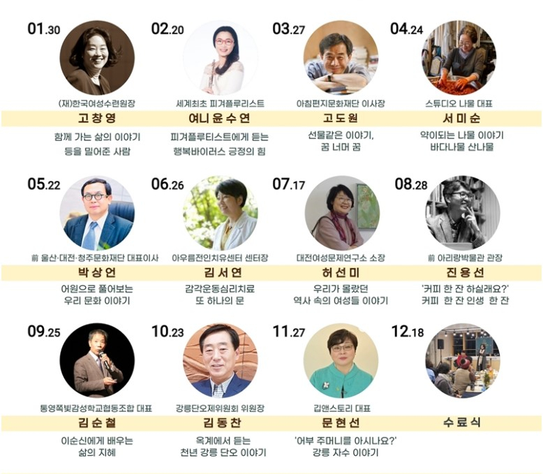 4월에는 서미순 스튜디오 나물 대표의 ‘약이 되는 나물 이야기 바다나물 산나물’을 들을 수 있고 이어 박상언 전 울산·대전·청주문화재단 대표이사, 김서연 아우름전인치유센터장, 허선미 대전여성문제연구소장, 진용선 전 아리랑박물관장, 김순철 통영쪽빛감성학교협동조합 대표, 김동찬 강릉단오제위원장, 문현선 깁앤스토리 대표의 강의도 마련됐다.