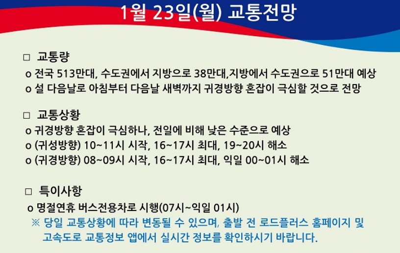 이날 오전 8시부터 전국적으로 시작된 귀경길 교통체증은 오후 4시께 절정을 이룬 뒤 다음날 0시께 해소될 것으로 전망된다. 귀성길 교통체증은 오후 4시께 가장 극심했다가 오후 7시께 풀릴 것으로 보인다.