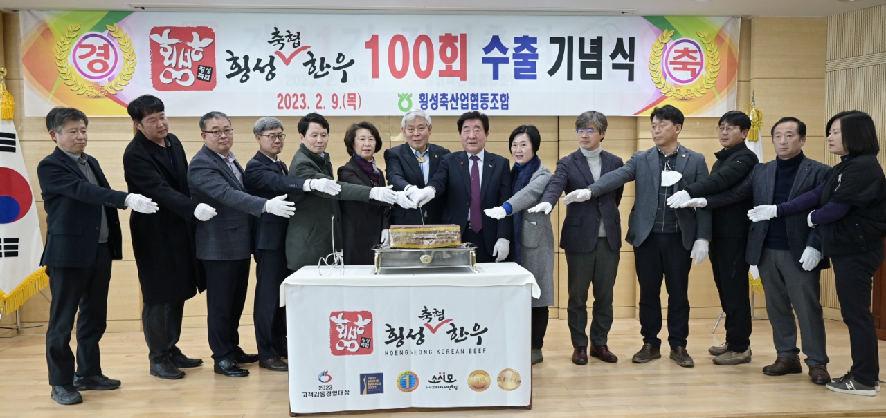 횡성축협은 9일 축협에서 김명기 군수, 김영숙 군의장과 군의원, 기관단체장, 조합원 등 100여명이 참석한 가운데 ‘횡성축협한우 수출 100회 기념식’을 갖고 자축했다.