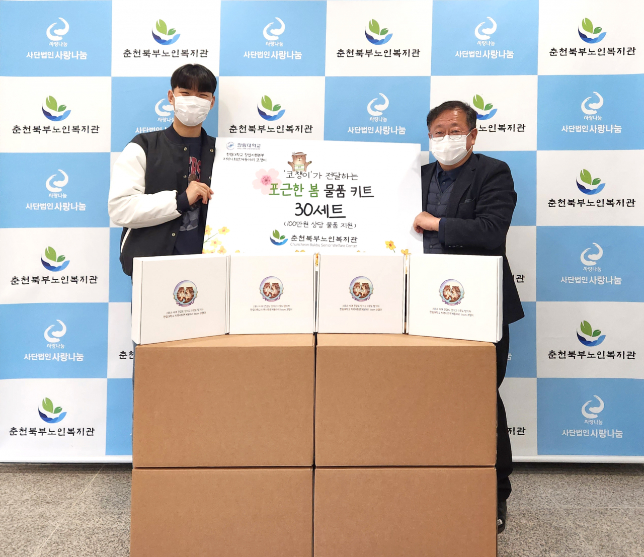 한림대학교 지역사회연계동아리 코챙이(대표:이상훈)는 9일 지역사회 취약계층 어르신들이 따뜻하게 겨울을 나고 포근한 봄을 맞이할 수 있도록 담요, 텀블러, 수면양말 등으로 구성된 키트 30세트를 춘천북부노인복지관(관장:박재호)에 전달했다.