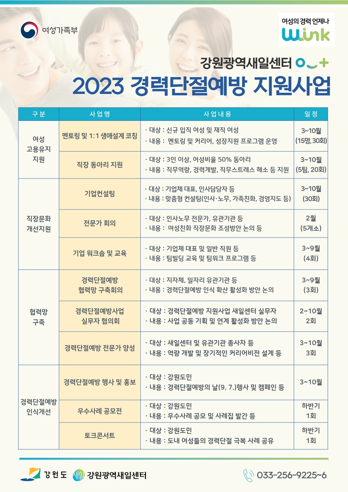 강원광역새일센터와 춘천 및 강릉 센터 등이 참여하는 이번 서비스는 여성 고용 유지 지원, 직장 문화 개선 지원, 협력망 구축, 인식 개선 강화 등 4개 분야로 추진된다.