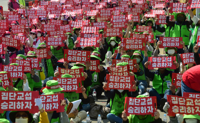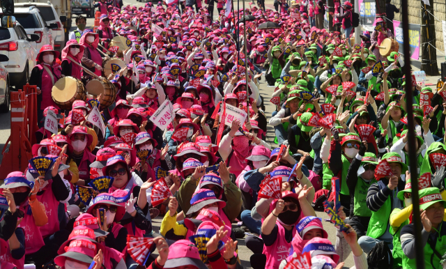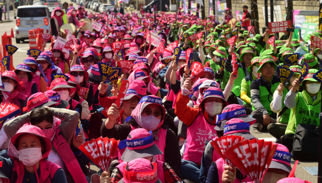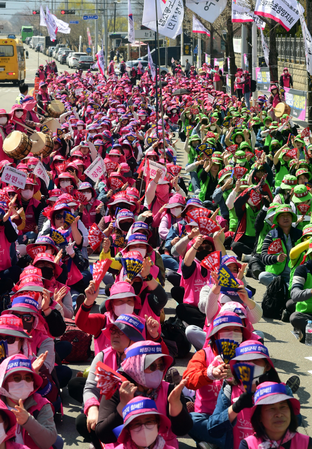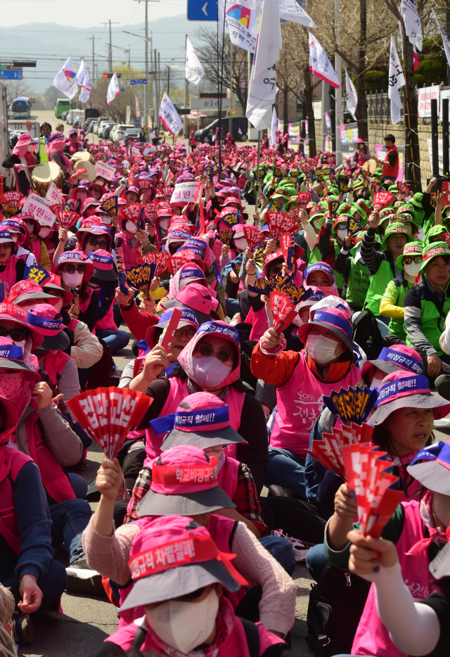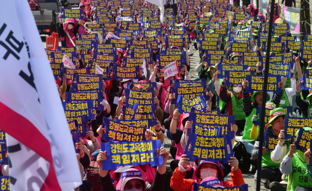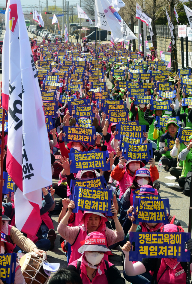 학교비정규직노동자 3.31 신학기 총파업 강원권대회가 31일 강원도교육청앞에서 열려 집회에 참여한 학교 비정규직 노동자들이 실질임금 인상, 비정규직 차별 철폐 등을 요구하며 구호를 외치고 있다. 박승선기자