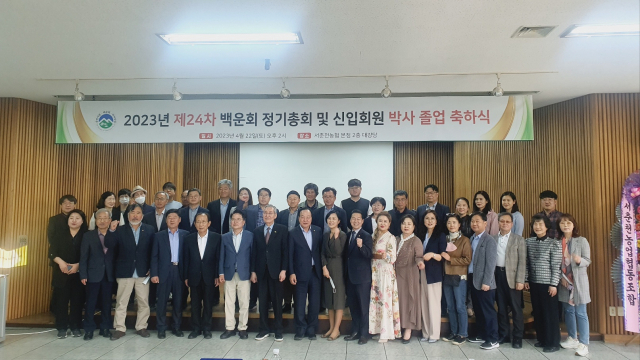춘천 서면 출신 박사들의 모임인 '백운회'는 지난 22일 서춘천농협 본점 대강당에서 송병훈 회장, 한기호 국회의원, 육동한 춘천시장, 박찬흥 도의원, 권희영 춘천시의원을 비롯한 회원 등이 참석한 가운데 2023년 제24차 백운회 정기총회 및 신입회원 박사 졸업 축하식을 가졌다.