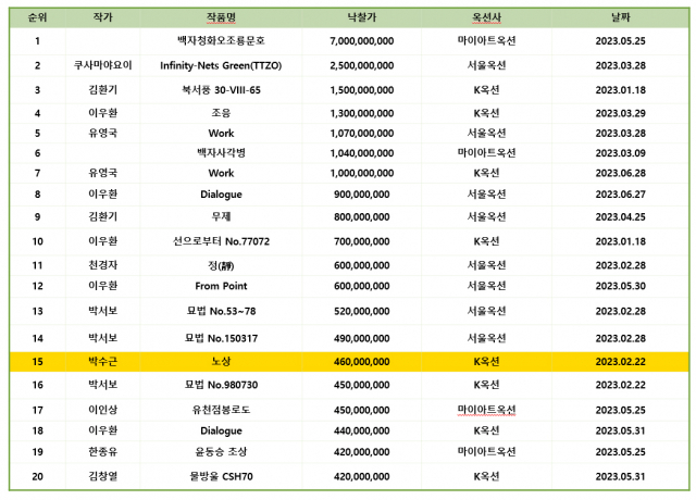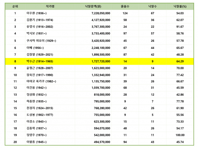 1만 4,851점 출품·7,724점 낙찰…박수근 ‘노상’ 15위