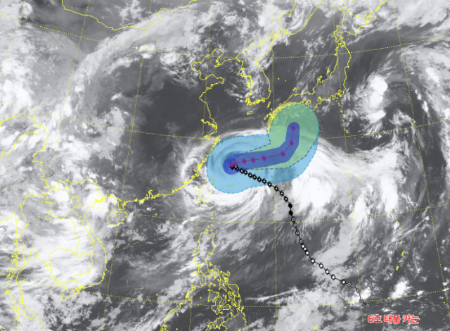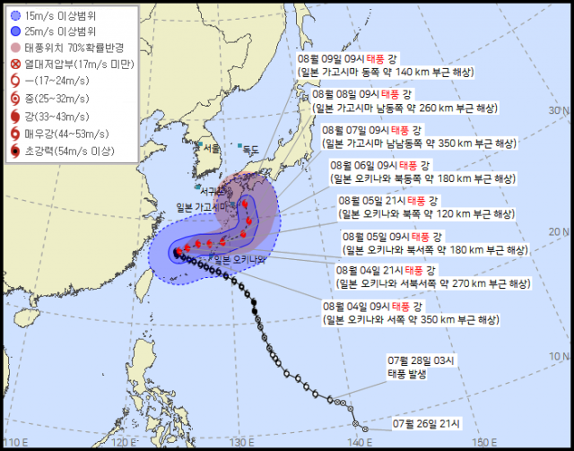 이어 7일 오전 9시께 중심기압 960hPa, 최대풍속 초속 39m/s, 시속 140km/h, 강도 '강'으로 일본 가고시마 남남동쪽 약 350km 부근 해상에 다다르겠다.