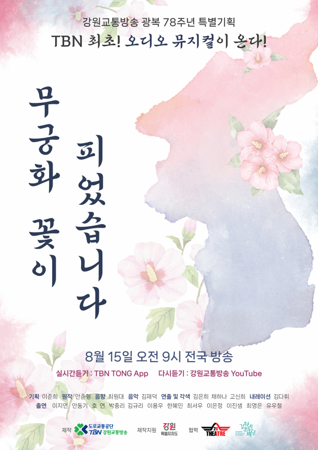 TBN강원교통방송은 오는 15일 오전 9시 TBN한국교통방송 라디오 채널을 통해 오디오 뮤지컬 ‘무궁화 꽃이 피었습니다’를 송출한다. 강원권 방송사로는 처음 제작한 ‘오디오 뮤지컬’이라 더욱 기대를 모은다.