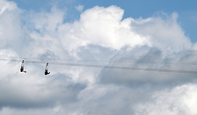 타는 듯한 더위가 멈출 줄 모르는 나날이지만 높아지는 하늘을 보면 가을이 다가오고 있음을 느낄 수 있다. 16일 춘천 남이섬에서 짚와이어를 탄 관광객이 마치 구름을 타고 있는 듯 하다. 신세희기자