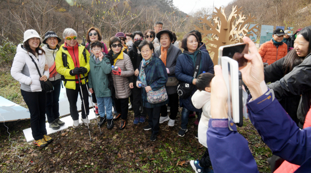 ‘엄홍길 대장과 학술림 숲길 걷기’ 코스에서는 학술림 입구에서 헬기장 반환점을 도는 왕복 8㎞ 구간에서 참가자들이 엄홍길 대장과 함께 걸으며 이야기를 나누고 강원대 학술림의 아름다운 절경을 만끽했다. 또 자연학습장 곳곳에 마련된 나무조형물에서 서로 다른 글자를 찾아 조합해 정답 문장을 맞추는 이벤트도 즐겼다.