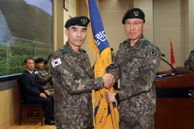 제12대 육군 과학화전투훈련단장 취임식이 13일 부대 내 종합사후검토실에서 열린 가운데 이상렬 신임단장(소장·사진 오른쪽)이 이규준 육군교육사령관(중장)으로부터 부대기를 전달받고 있다.