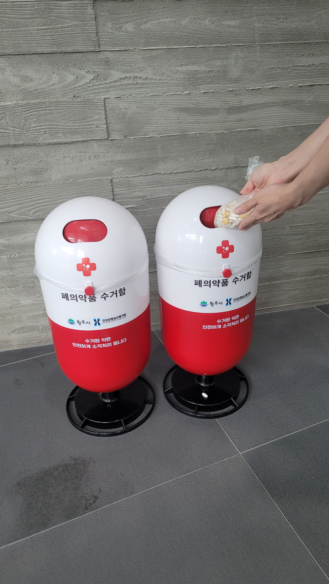 처리 방법을 고민하던 찰나 박씨는 ‘폐의약품 안심처리 사업’에 대해 알게 됐다. 최근 의약품으로 인한 전국 토양 및 하천오염 등 생태계 파괴가 심각해짐에 따라 건강보험심사평가원은 빨강색과 흰색으로 이루어진 알약 모양의 수거함을 곳곳에 배치하고 원주시내 모든 약국에 배포된 파란색 수거함을 통해 폐의약품을 수거‧소각하고 있다.