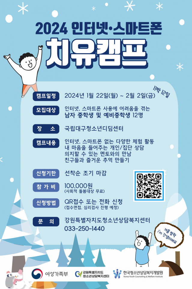 강원특별자치도 청소년상담복지센터가 오는 5일까지 ‘2024 청소년 인터넷·스마트폰 치유캠프’ 참가자를 모집한다.