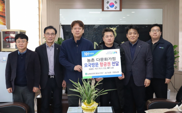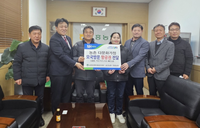 NH농협은행 횡성군지부(지부장:최종웅)는 15일 농촌 다문화가정 모국 방문 사업 일환으로 여성 결혼 이민자 가족이 함께 모국을 다녀 올 수 있도록 왕복항공권, 가구당 70만원 체재비, 여행자보험가입증서를 전달했다. 위 사진은 공근농협(조합장:김장섭)에서 열린 이기수·타파아나타(네팔)씨 부부, 문종철·샤르쉔예바라리사(키르기스스탄)씨 부부 전달행사. 아래 사진은 안흥농협(조합장:임원규)에서 열린 김남인·누엔티안다오(베트남)씨 부부 항공권 전달식.