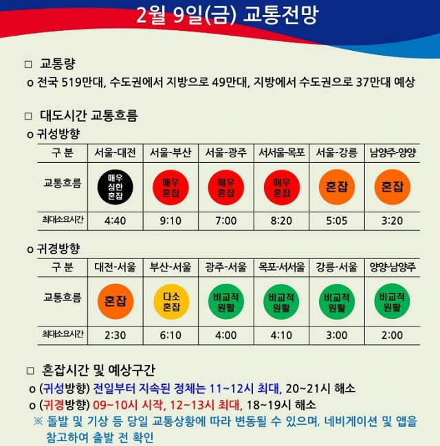 한국도로공사는 9일 고속도로 최대 소요 예상시간을 강릉에서 서울까지 5시간 5분, 남양주에서 양양까지 3시간 20분으로 내다봤다. 전날부터 전국적으로 시작된 지방 방향 고속도로 교통체증은 오전 11시께 절정을 보인 뒤 오후 8시가 돼서야 해소될 것으로 보인다.