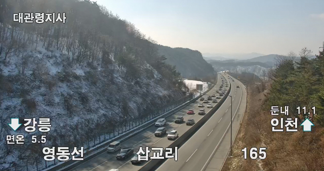 영동고속도로는 인천에서 강릉 방향으로 마성터널 부근~용인 5㎞, 용인~양지터널 부근 6㎞, 여주휴게소 부근~여주 JC 3㎞, 횡성휴게소~둔내 부근 9㎞, 동둔내Hi 부근~둔내터널 4㎞, 면온~봉평터널 2㎞ 구간에서 정체가 빚어지고 있다.