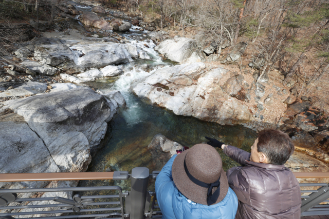 ■지척에서 느끼는 지리산 중산 두류생태탐방로=두류생태탐방로는 지리산의 이명(異名)이 두류산이라는 점에 착안해 이름 붙였다. 중산리 계곡은 지리산 최고봉인 천왕봉에서 비롯된 계곡이다. 천왕봉으로 향하는 등산로이기도 하다. 천왕봉과 중봉 사이에서 발원한 계류가 용추폭포를 거치면서 수량을 더해 써리봉에서 흘러오는 계곡물과 만나면서부터는 우렁찬 물소리와 함께 수려한 경관이 펼쳐진다. 맑은 공기, 싱그러운 숲과 더불어 중산리 계곡을 바로 옆에 두고 감상하며 걸어볼 수 있다. 중산두류생태탐방로의 시작점은 지리산중산산악관광센터로 1.2㎞ 길이의 구간이다. 중산관광센터는 지리산 천왕봉까지 직선거리로 약 5㎞에 불과하다. 지리산을 등산하지 않더라도 천왕봉을 가장 지척에서 느낄 수 있는 길이다. 탐방로를 걷다 보면 우렁찬 계곡소리와 함께 집채만 한 커다란 기암괴석을 감상할 수 있다. 산청군은 중요 포인트마다 관람데크를 설치해 중산계곡의 정취를 느낄 수 있도록 했다. 탐방로 상층부에 닿으면 엄청난 규모의 돌무더기를 확인할 수 있는데 옛날 신선들이 놀았다해서 '신선 너들'이라고 불리는 곳이다. 한 바퀴 걷고 난 뒤 이맘때가 제철인 산청 고로쇠 수액을 마시면 갈증이 싹 가신다. 산청 고로쇠 수액은 시천, 삼장면 부근에서 채취돼 만물이 겨울잠에서 깨어난다는 경칩 무렵에 가장 맛이 좋다. 또 해발 1000m 내외의 지리산 청정골에서 자생하고 있어 타 지역에 비해 맑고 깨끗하며 단맛이 높아 인기를 끌고 있다.