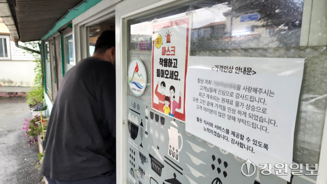 실제 강원물가정보에 따르면 이달 기준 도내 주요 외식메뉴 26개 품목 중 1년 전과 비교해 가격이 오르지 않은 품목은 1개 뿐이었다. 평균 상승률은 5.16%다.